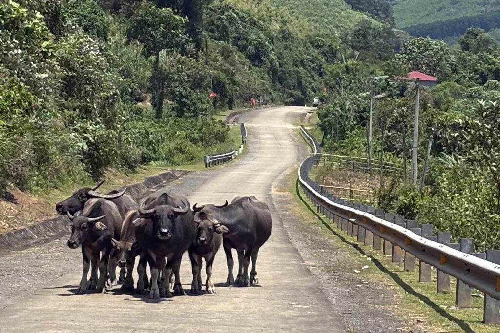 Occasionally, I had to slow down for the real locals: herds of water buffalo casually blocking the road. It’s the kind of thing that would never happen back home, but out here, it felt perfectly normal. I’ve passed dozens of herds on this trip, but these guys were particularly wary, they kept a close eye on me the whole time as I slowly rolled by.