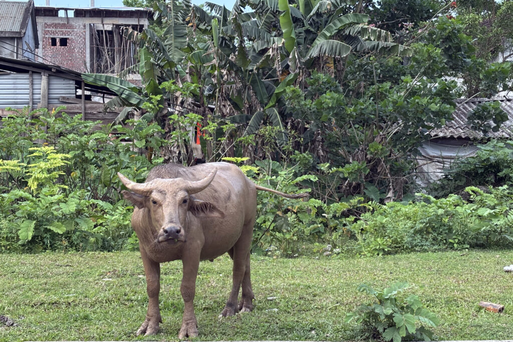 I’ve made it safely into Phong Nha, where I’ll be staying for several days. I’ll do a proper introduction to the area tomorrow, but in the meantime, I’ll leave you with this photo: an angry water buffalo I crossed paths with on my way to dinner. Judging by the look he gave me, he clearly wasn’t thrilled to see me.