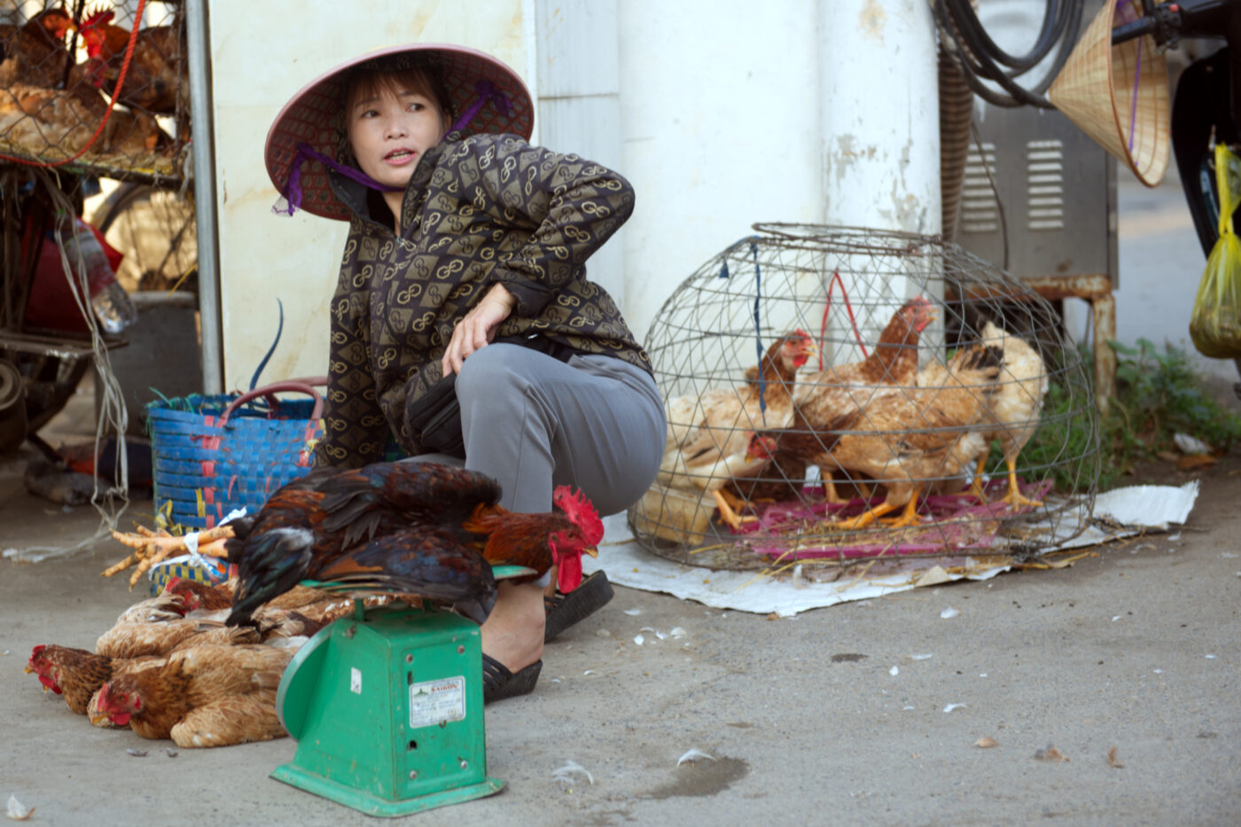 This morning, I visited a local market in Ninh Binh. I’ve always enjoyed morning markets, there’s something about watching locals shop for their daily groceries that feels more genuine than the curated tourist experiences. One vendor stood out to me in particular: she had two cages full of chickens, one on the ground and the other strapped to the back of her moped. When I passed by a second time, a customer had already bought nearly half of her stock, including her only rooster.
